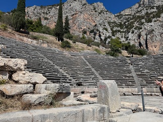 Today our pilgrimage took us to Delphi, one of the most important religious centers of the ancient Greek world. In antiquity, this was considered the very “navel” of the earth, marked by the Omphalos, a conical stone symbolizing the center of the world. Pilgrims would walk the Sacra Via, passing by the Athenian Treasury, the Theatre, and finally arriving at the Temple of Apollo, where the oracle once spoke her mysterious prophecies.